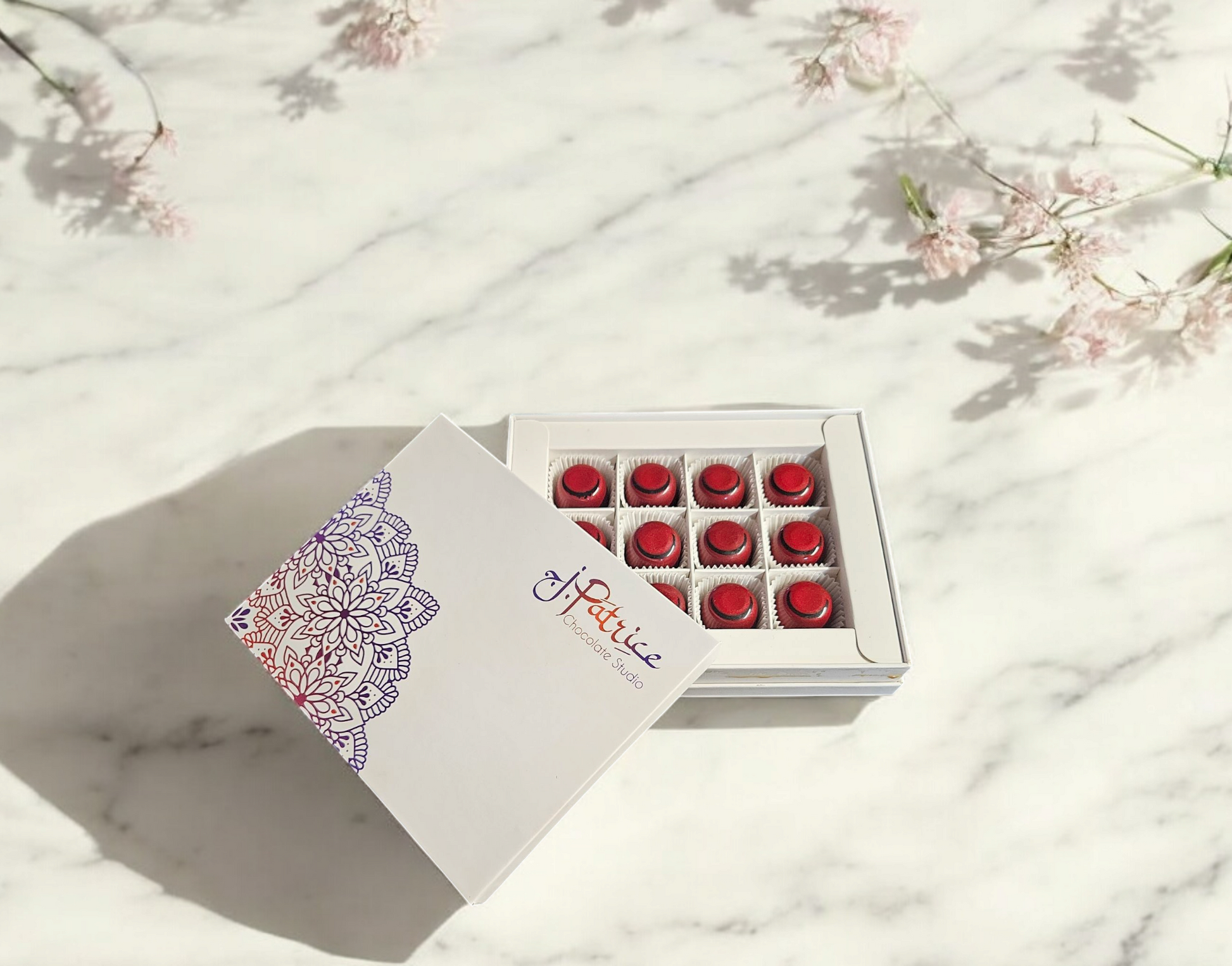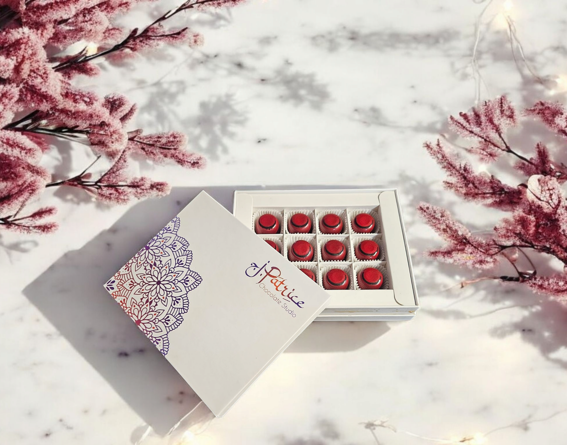 12 Pieces of our decadent Cherry Eclipse chocolate covered cherries. A luxurious indulgence featuring a whole, succulent Luxardo Marasca Cherry preserved in rich, velvety syrup, encased in a smooth, dark chocolate shell. Each bite offers a perfect balance of the cherry’s vibrant tart sweetness and the deep, bittersweet notes of premium chocolate