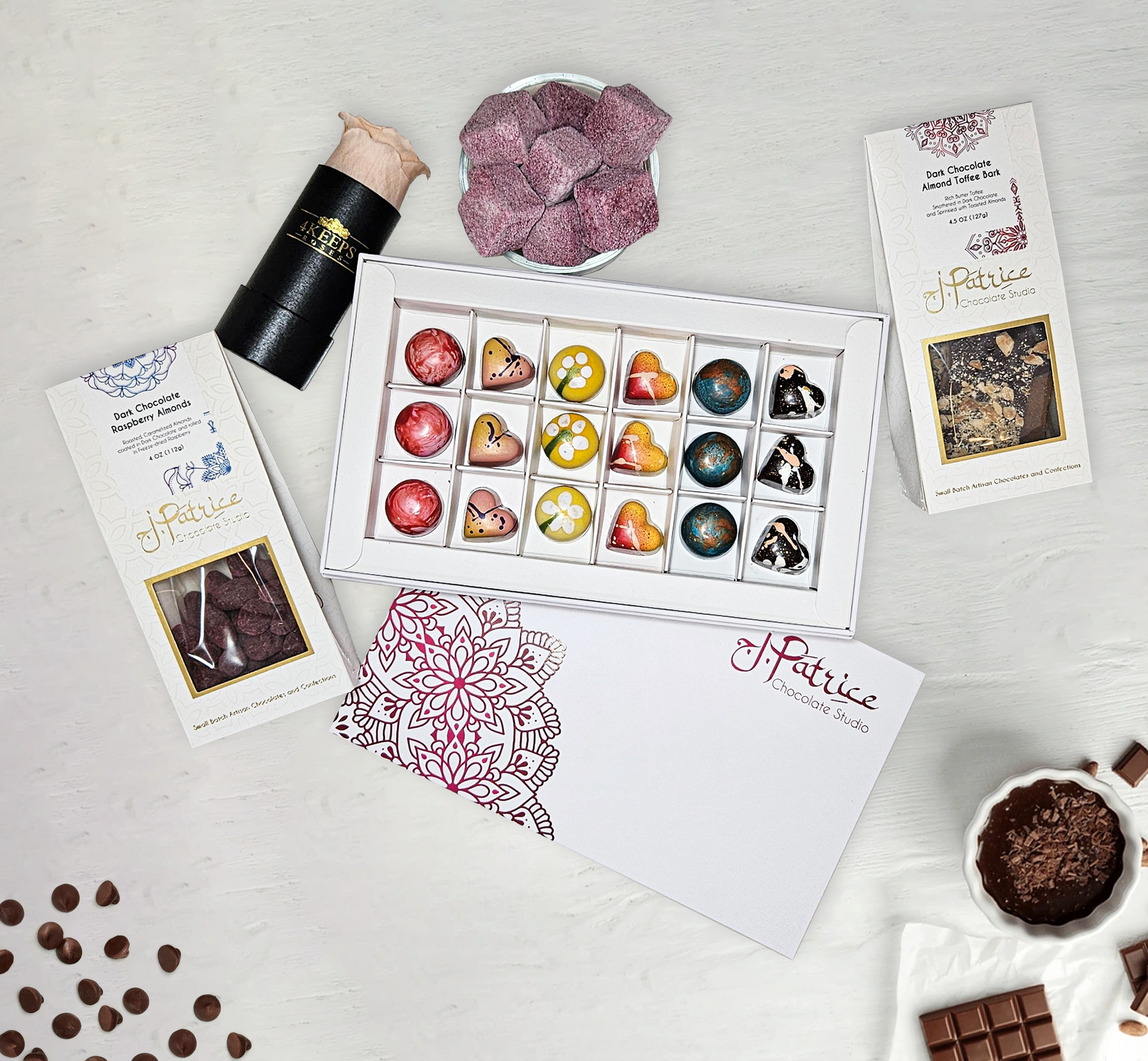 This Bundle includes Dark Chocolate Raspberry Almonds, Almond Dark Chocolate Toffee Bark, Blueberry Dragees and an 18 Piece Box of our Mother's Day Flavors (Three of each - Raspberry Rose ,Passionfruit, Sweet Ice Tea, Peach Hibiscus ,Caramel Pecan Cheesecake and Dark Biscotti) and a FREE long life, fragrant 4Keeps Rose.