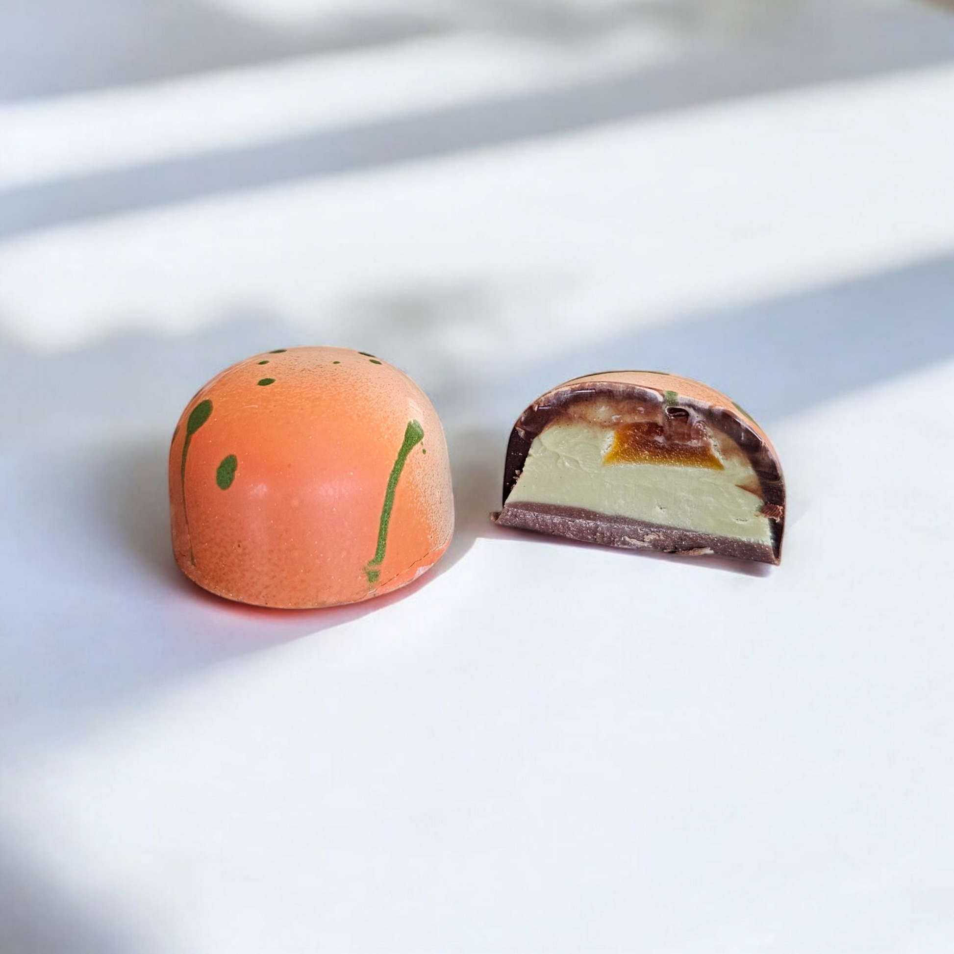 Creamy white chocolate pistachio gianduja topping a layer of intense apricot Qamar Al Deen filling in a milk chocolate shell.